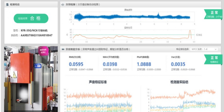 构建音频采集系统,实现产品分贝检测产线对音频的实时同步采集与型号关联。智能识别模型自动完成音频文件的接入、特征提取、智能判别等工作,输出对应产品条码号的实时判别结果,对异音自动报警,并针对识别结果对产品异音原因进行智能分类,辅助返修排故。系统将智能检验结果实时反馈至企业工业互联网平台,支持产线质量问题统计与分析。