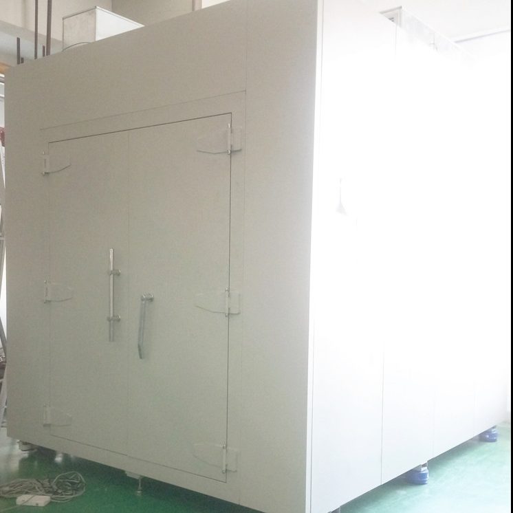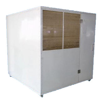 用25*25*1.0和25*50*1.0镀锌扁通焊接成框架形状,四周用0.5MM厚镀锌板密封,门采用方通及镀锌板作双层框架,配进口铍铜弹片包四周,以增加碰触面及屏蔽效果,门侧上半部分别为8层屏蔽网,表面一层为铁网,内部为铜网,以免碰穿,起到保护作用,同时网的部份也可以用来做透视窗,铜网与镀锌板拼装;屏蔽房顶部安装30*30金铃排气扇;地面用1.5cm厚夹板作地板,贴12"*12"*1.2MM阻燃地板胶。屏蔽房底部安装可移动轮子,带刹车;安装方便,可移动,可拆迁,双层结构