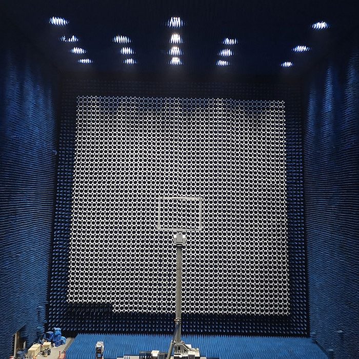 暗室屏蔽体内侧的六个面均铺设有吸波材料,目的是将各种杂波(含杂反射、绕射、散射波等)减少到最低程度,主要用于微波天线系统的参数测量、车载GPS系统及倒车雷达测试、雷达截面测试、电子战及仿真模拟。